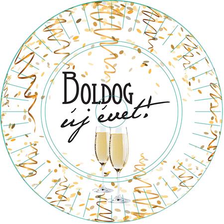 Válaszd ezt a vidám, színes, "Boldog új évet" feliratú tányér készletet.