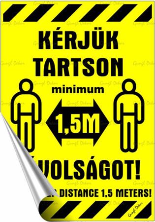 Információs matrica, 11,6x16,6 cm, kétnyelvű, "Kérjük tartson mininum 1,5 m távolságot!"