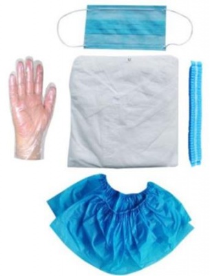 Szett tartalma: 1 pár fóliakesztyű (L), 1 pár kék PE cipővédő, 1 db kék harmonikás hajháló, 1 db 3rétegű kék, gumis szájmaszk, 1db fehér tépőzárás PP látogató köpeny (XL).